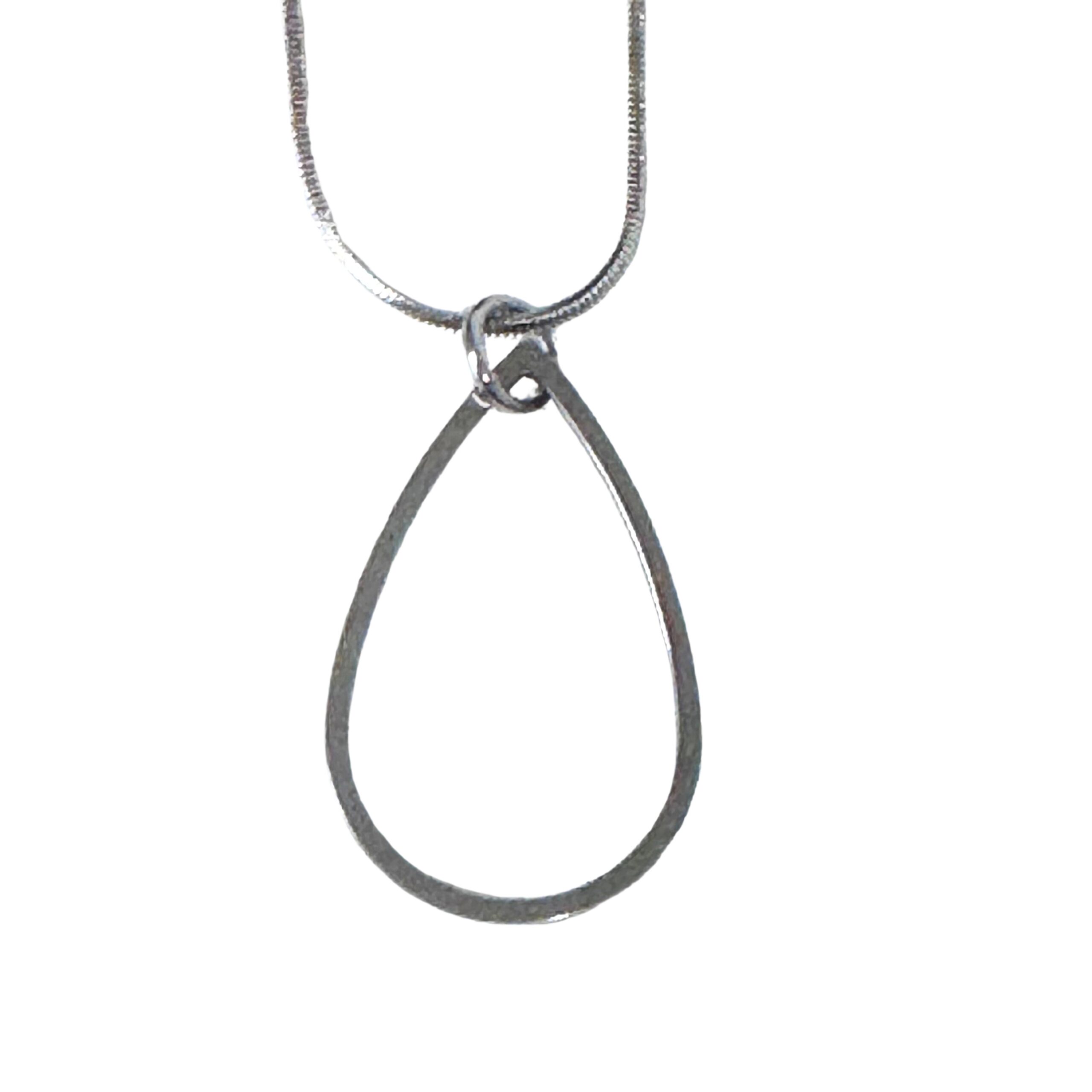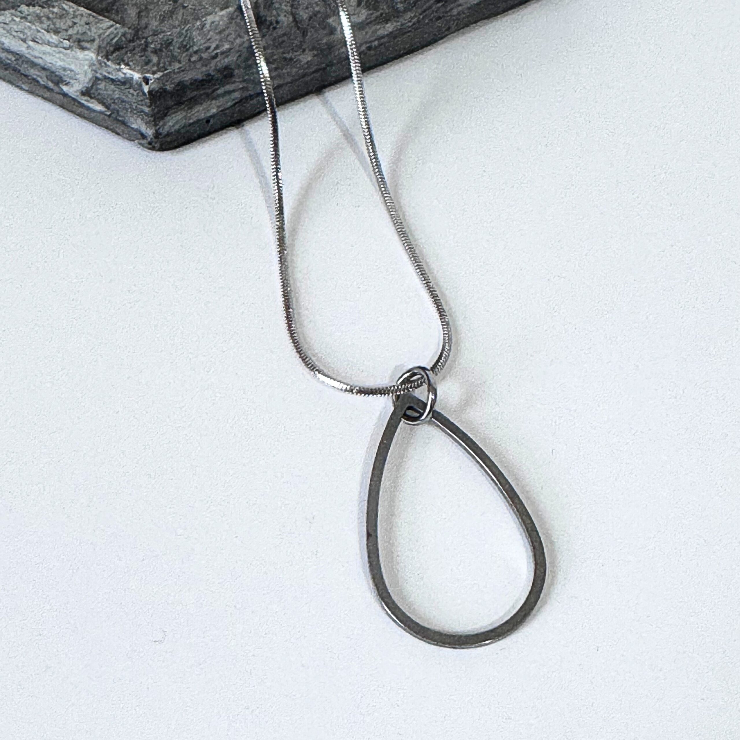 A simple steel pendant featuring a 25mm teardrop charm on an 18 inch (45.7cm) steel snake chain.